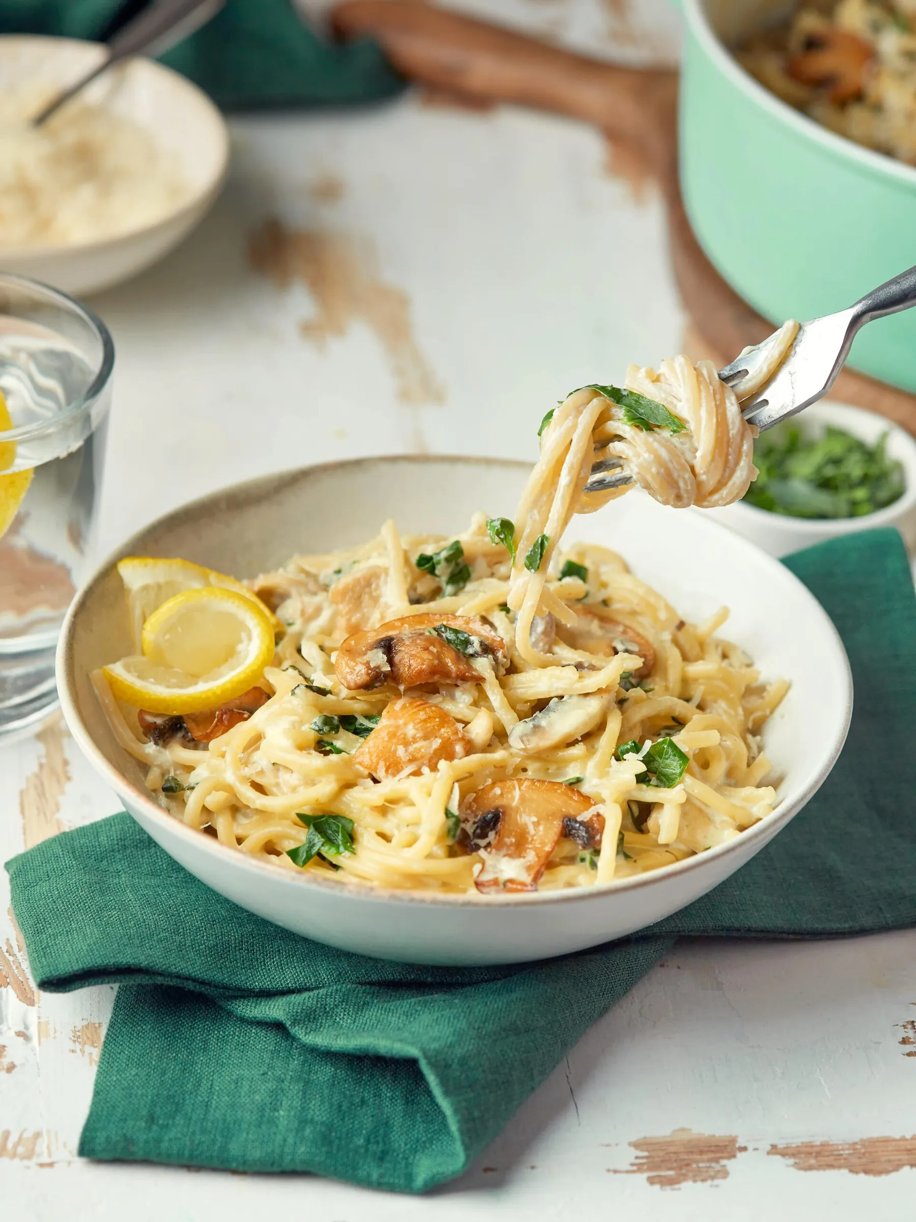 Garnish the spaghetti with creamy chicken and mushroom sauce with fresh parsley and decorate with a slice of lemon on top. Serve immediately!