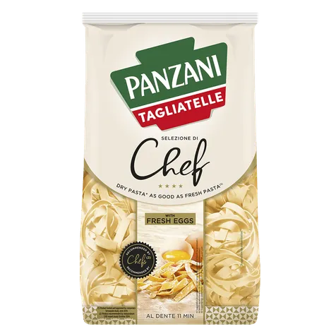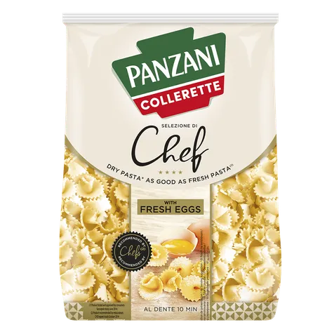 Panzani Chef’s Selection Collerette add an original touch to your dishes with their elegant shape and delicate texture. Made with fresh eggs, they offer a rich flavour and a firm yet melt-in-the-mouth consistency, perfect for pairing with hearty sauces or meat dishes. This pasta is ideal for impressing your guests with its sophisticated appearance and flavour worthy of the finest tables.
